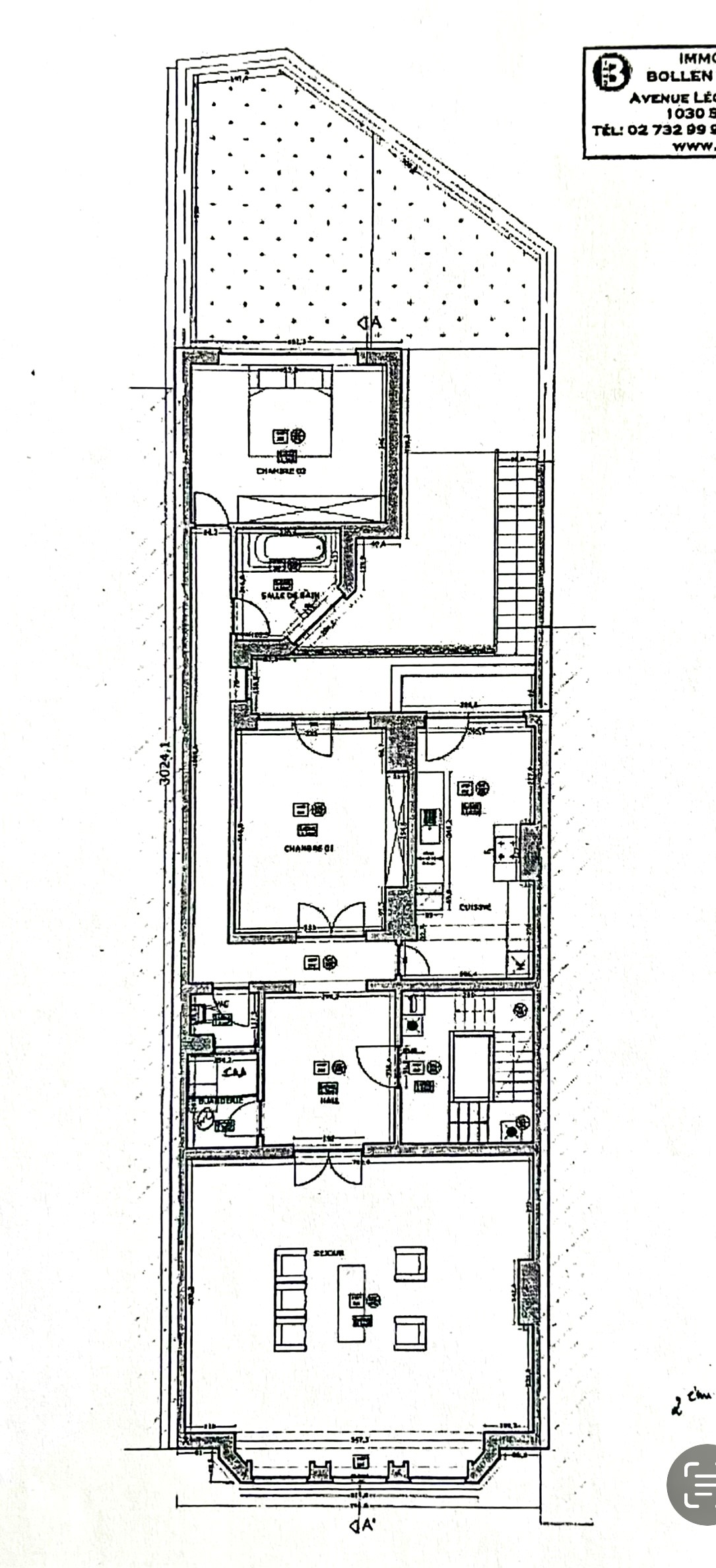 Close to the RTBF building and access to the E40, lovely +/-141 sqm apartment on the 2nd floor of a 4-apartment condominium in a building built in 1934, including an entrance hall with toilet, a spacious +/-50m² living room, a super-equipped kitchen with laundry area and small terrace, 2 bedrooms (+/-15 and 20m²), a bathroom, a shower room, 2 cellars (+/- 1.6 and 3.3m²).